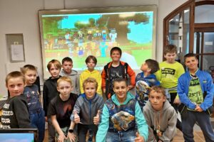 Setkání dětí z kroužků Minecraft na vánočním eventu na serveru. Setkání probíhá online z domu, Domino je zavřené. K připojení je třeba znalosti samostatného přihlášení na Minecraft server Domina a program pro komunikaci online (Discord).